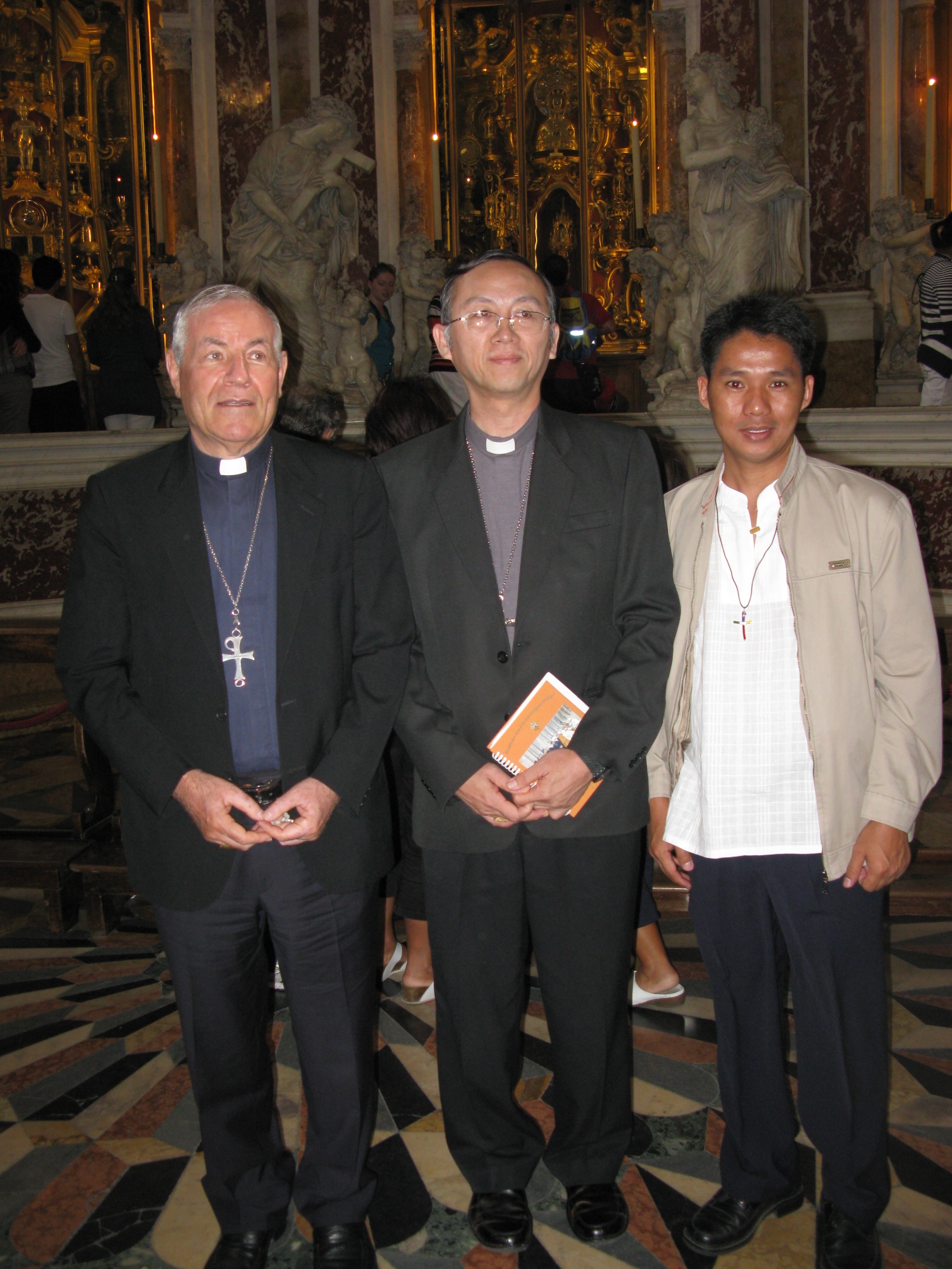Il giorno 28 agosto 2010 e' arrivato in Italia il Vescovo Mons. Francesco Saverio Wira' (nella foto al centro) che da 18 mesi guida la diocesi di Chiangmai, dove prestano il loro ministero pastorale i preti Fidei Donum delle 15 diocesi del Triveneto in un progetto di Cooperazione tra la Chiesa del Nord-Est e la Chiesa e la stessa Chiesa di Chiangmai (Thailandia). Assieme al Vescovo e' arrivato anche un giovane prete diocesano, padre Giovanni Battista Werasak (a sinistra), che studiera' Filosofia nei prossimi tre anni per tornare poi al suo servizio come insegnante nel Seminario Teologico Nazionale.